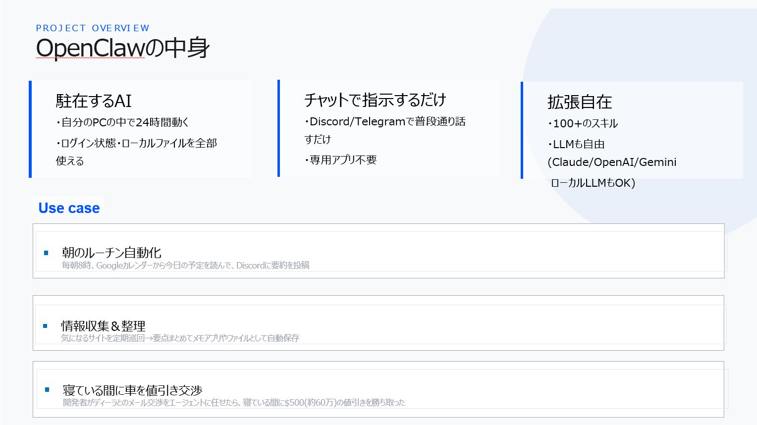 - 無限に増える「スキル」: 開発者コミュニティが日々生み出す「ブラウザ操作」や「ファイル操作」といった技を、まるで育成ゲームのようにAIに覚えさせることができる。