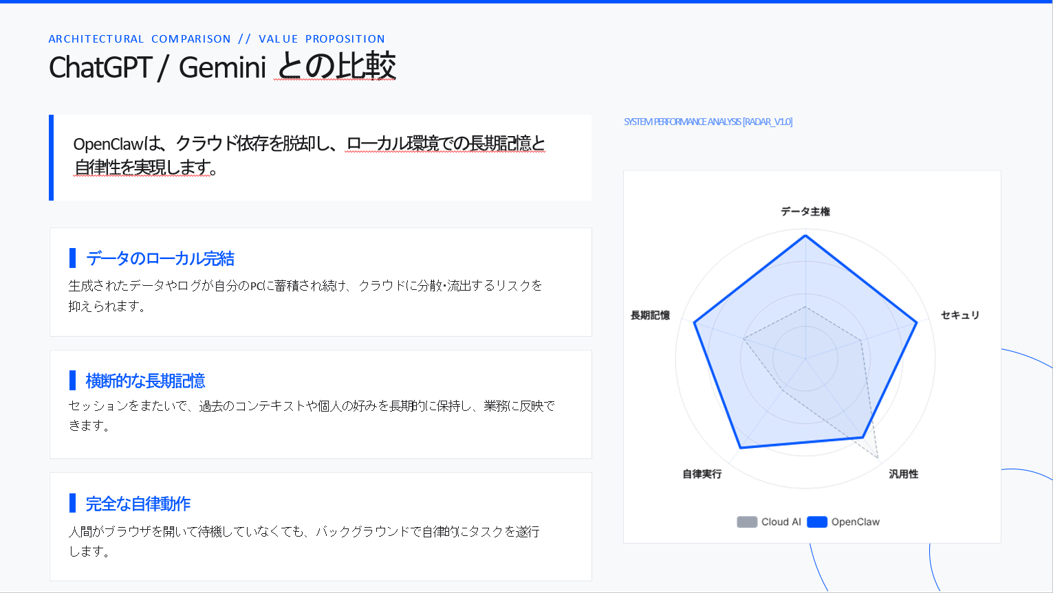 なぜこれほどの結果が出るのか。 それは、AIが「データのローカル完結」と「横断的な長期記憶」を併せ持っているからです。 過去のタスクや個人の好みをPC内に蓄積し続けることで、使えば使うほど、世界で唯一の「自分を理解し、自ら動く秘書」へと進化していく。 従来のチャットAIでは到達できなかった、真のパーソナライズがここにあります。