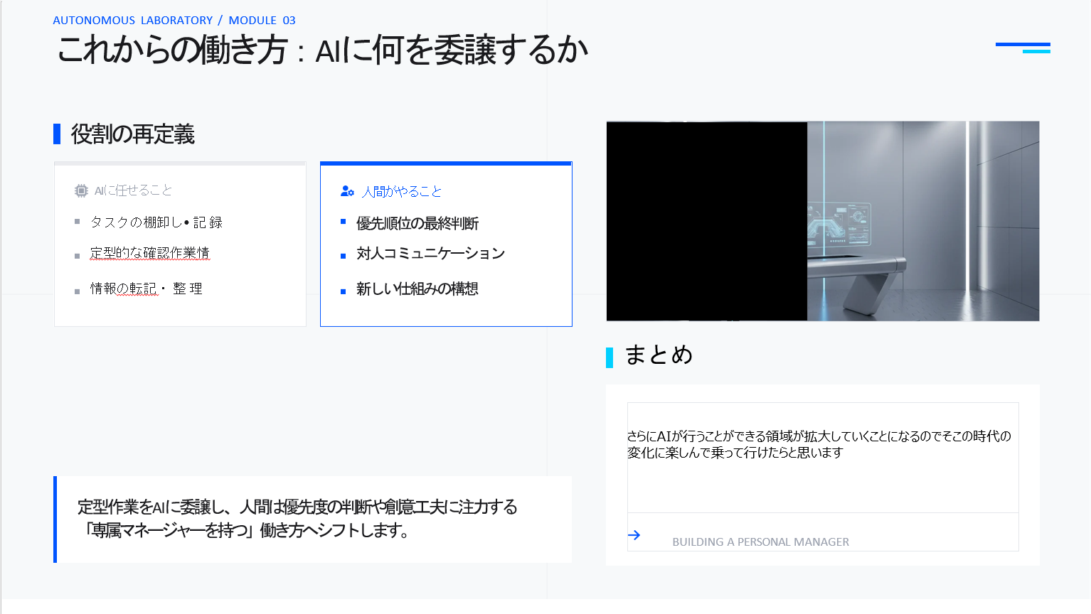- 人間(創造・判断): 優先順位の最終決定、対人コミュニケーション、ゼロからの仕組み作り。