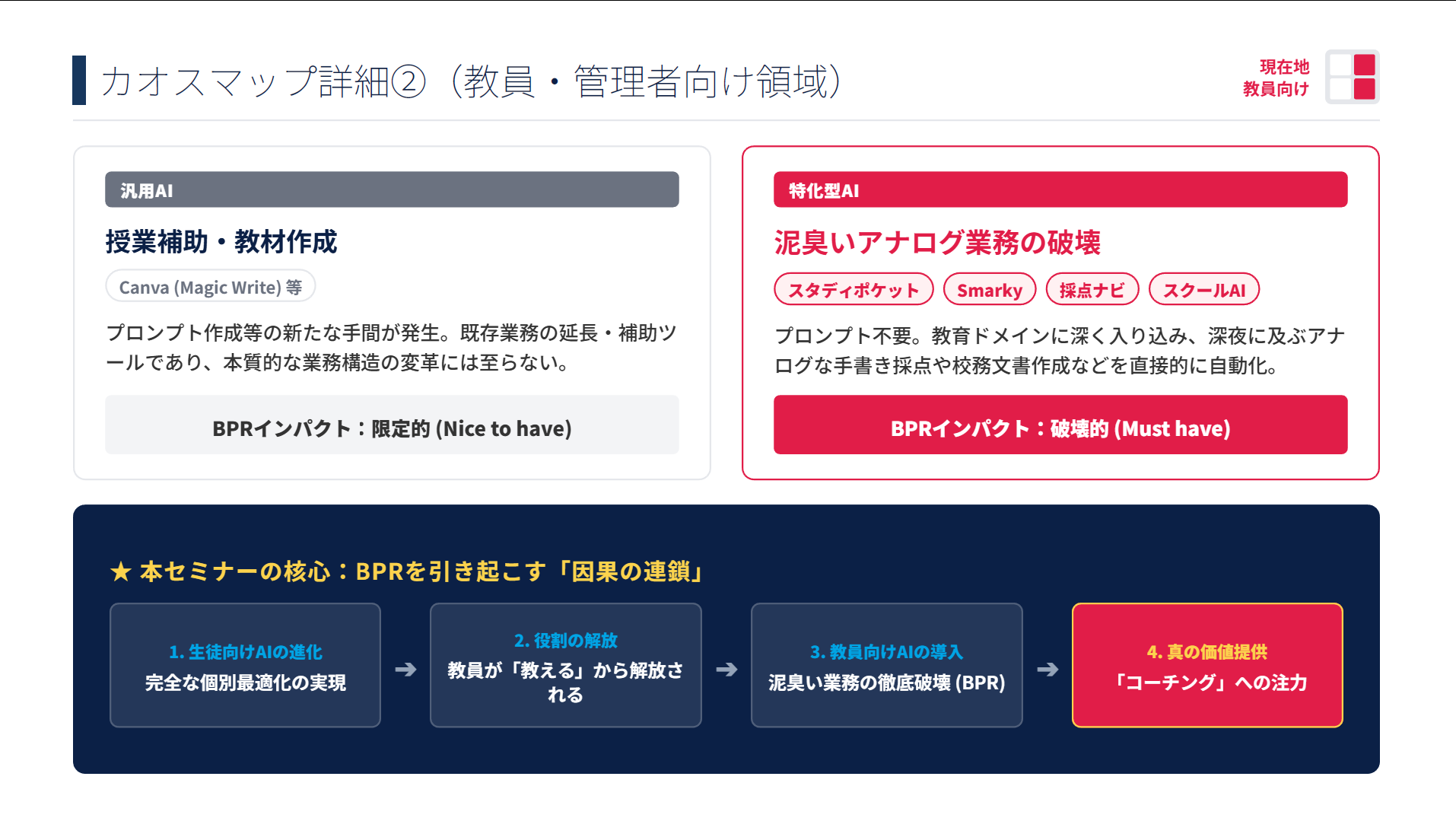 セミナーでは、教育ドメインに深く入り込み、本質的なBPRを引き起こす「特化型AI」の事例が紹介されました 。