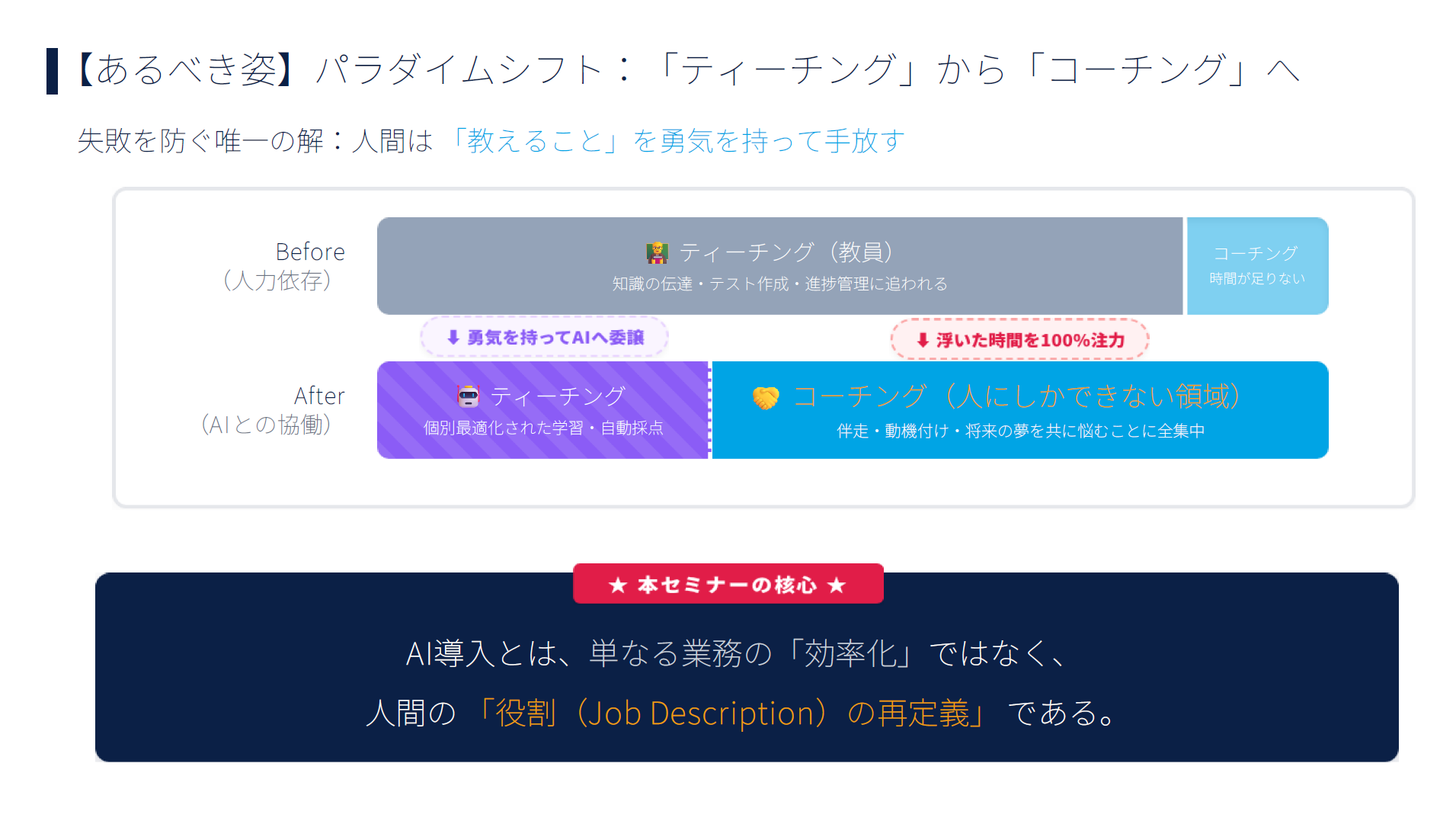AIが個別最適化された「ティーチング(知識の伝達)」を担うことで、教員は浮いた時間を、人間にしかできない「コーチング(伴走・動機付け・進捗管理)」に全集中できるようになります 。AI導入とは単なる業務の効率化ではなく、人間の役割(Job Description)の再定義なのです 。