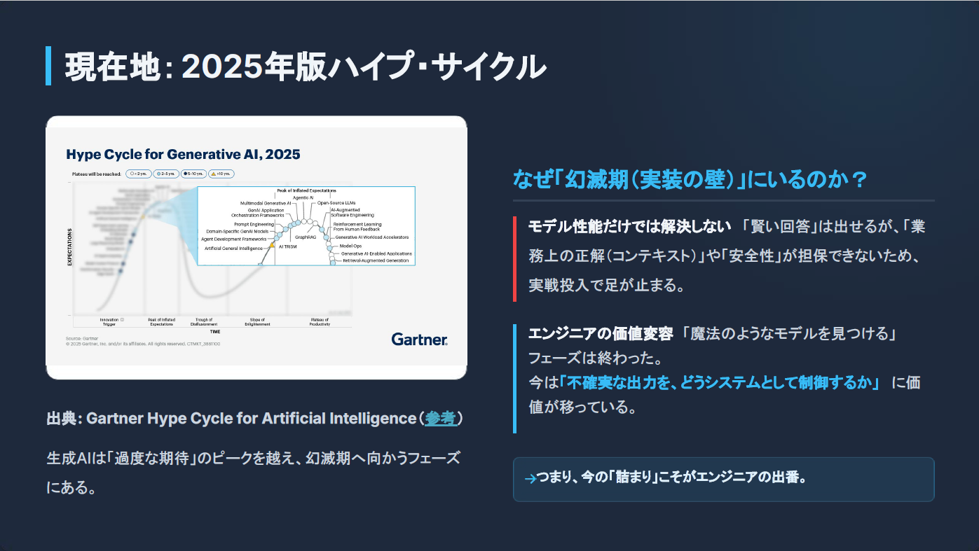 「デモでは凄かったのに、実業務に組み込んだら使い物にならなかった」。2025年、多くの企業がこの「幻滅期」の壁に直面しました 。