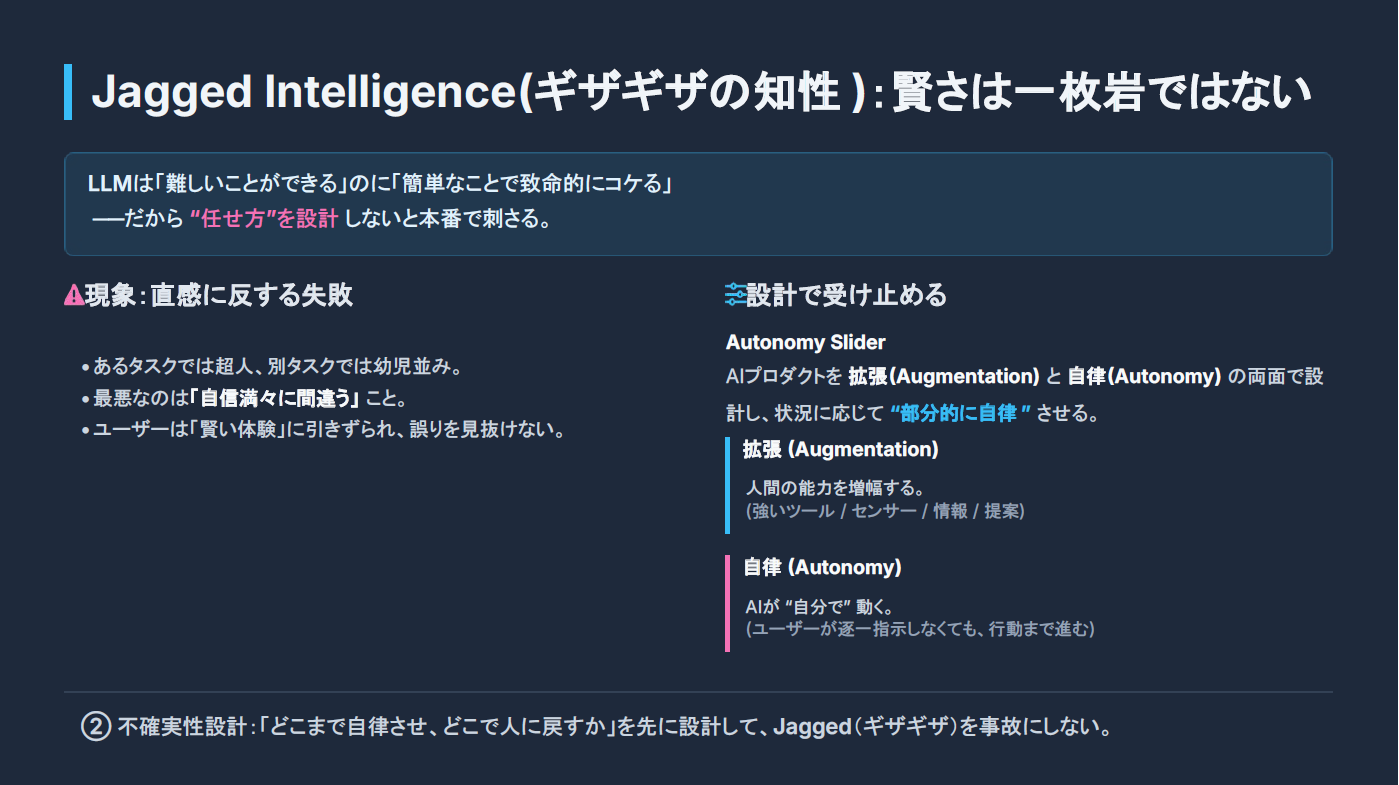 セミナー前半で田渕が指摘したのは、現在の生成AIが持つ「Jagged Intelligence(ギザギザな知性)」という特性です 。 AIはある分野では超人的な能力を発揮する一方で、人間なら絶対に間違えないような簡単な計算や論理で、自信満々にミスを犯します 。