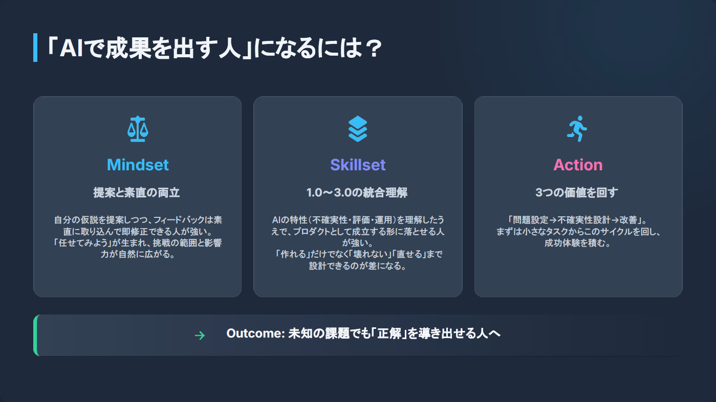 技術的な変化に加え、エンジニアのマインドセットについても言及がありました。 変化の激しいAI時代において最強の資質は、「提案と素直さ(柔軟性)の両立」です 。